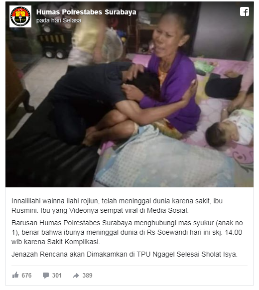 Ibu ini menjadi viral karena kepalanaya di injak oleh anak kandungnya sendiri. Dan telah di kabarkan bahwa ibu ini telah meninggal dunia pada (27/08/2019) di Rumah Sakit Soewandi Surabaya.