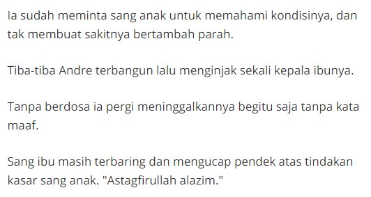 Berita ini pernah membuat netizen menjadi sangat geram terhadap anaknya yang bernama Andre ini tega menginjak kepala Ibundanya yang sedang terbaring lemah karena sakit jantung.