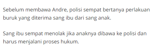 Lantaran uang 10ribu untuk andre makan di luar ibunya tidak penuhi yang membuat andre menjadi emosi. Sang Ibu sedang terbaring lemah karena sakit dan sedang di rawat oleh kakaknya.